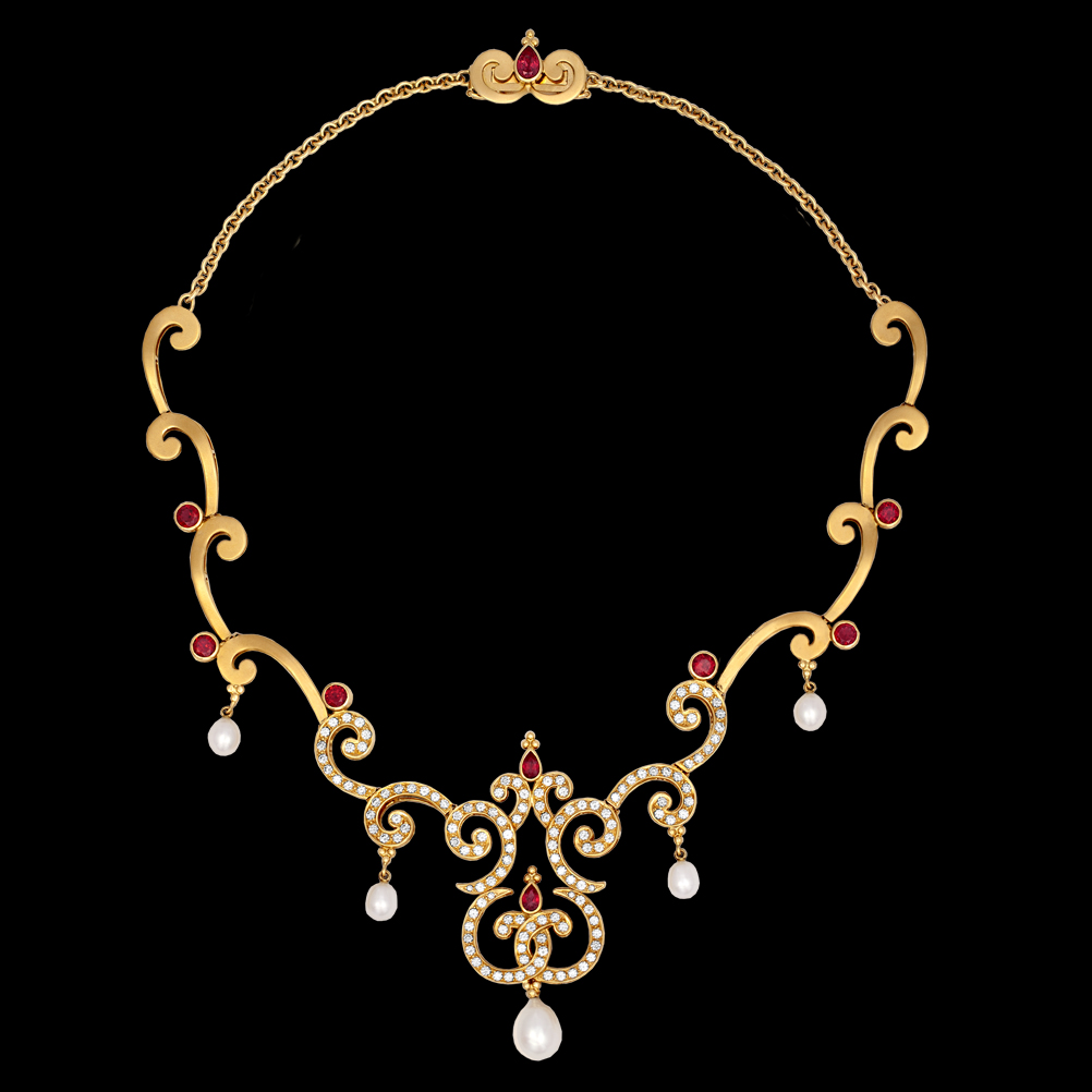 This beautifully elegant and feminine Crevoshay necklace was created for the 2013 one-woman exhibition titled “Garden of Light” at the Carnegie Museum of Natural History. 18K yellow gold with Spinel, Pearl and Diamond.