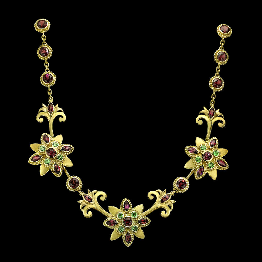 18K yellow gold with Rhodolite Garnet and Tsavorite. Special Provenance; “Beyond Color” Collection. Headley Whitney Museum, Marylou Whitney. John Hendrickson Galleries Inaugural Exhibition, February through July 2009.
