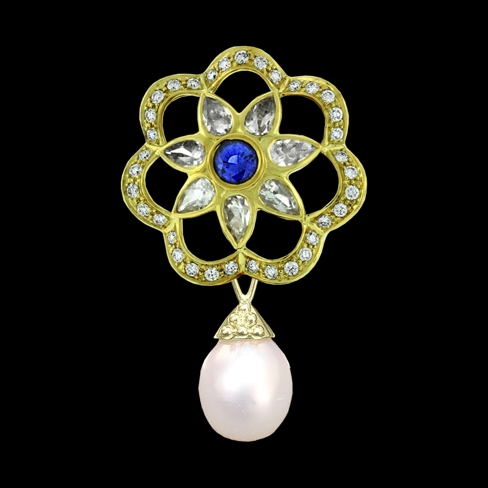 18K yellow gold with Sapphire, Moonstone, Diamonds and pearl.