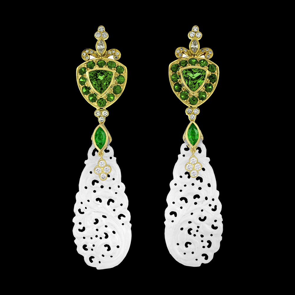 Stunning beauty and glamour are always in style when it is important to make an entrance! 18K yellow gold with Tsavorite, and Jade.