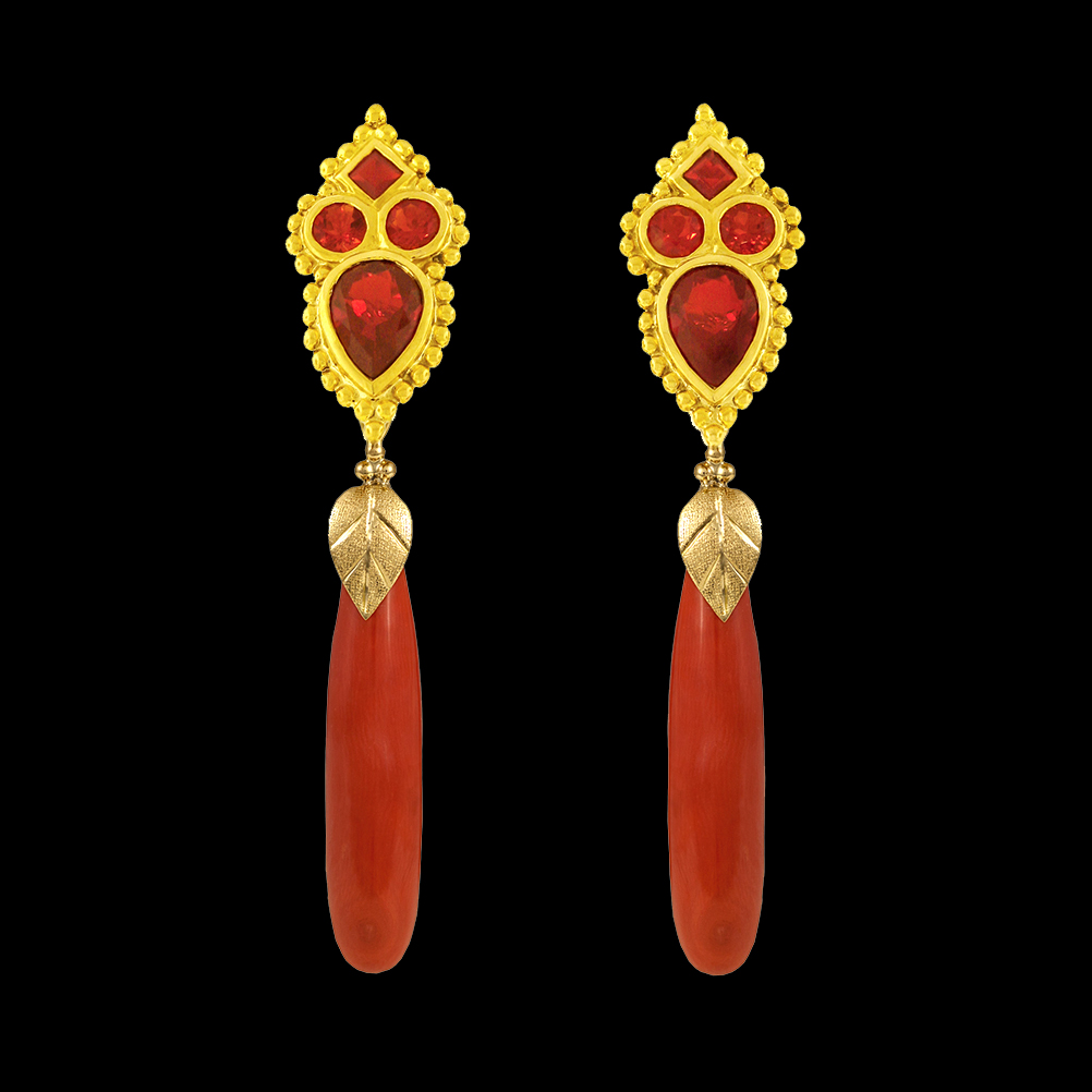 The lovely 18K yellow gold Crevoshay earrings with the reddish-orange glow of these Fire Opals will undoubtedly create a feeling of warmth and well-being in the wearer. ~18K yellow gold with Opal and? ?Coral.