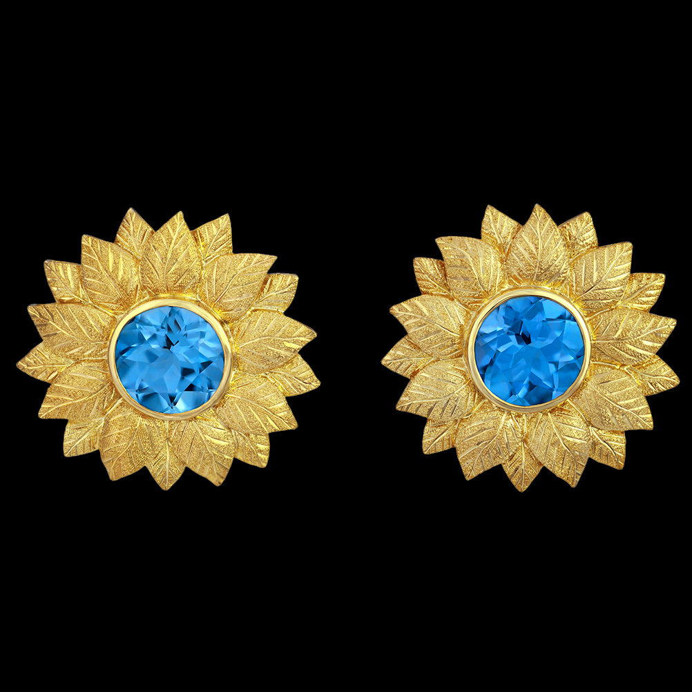 These cheerfully elegant 18K Crevoshay earrings feature bezel set blue topaz in a flower design with 18 hand engraved and textured petals each. 18K yellow gold with Topaz