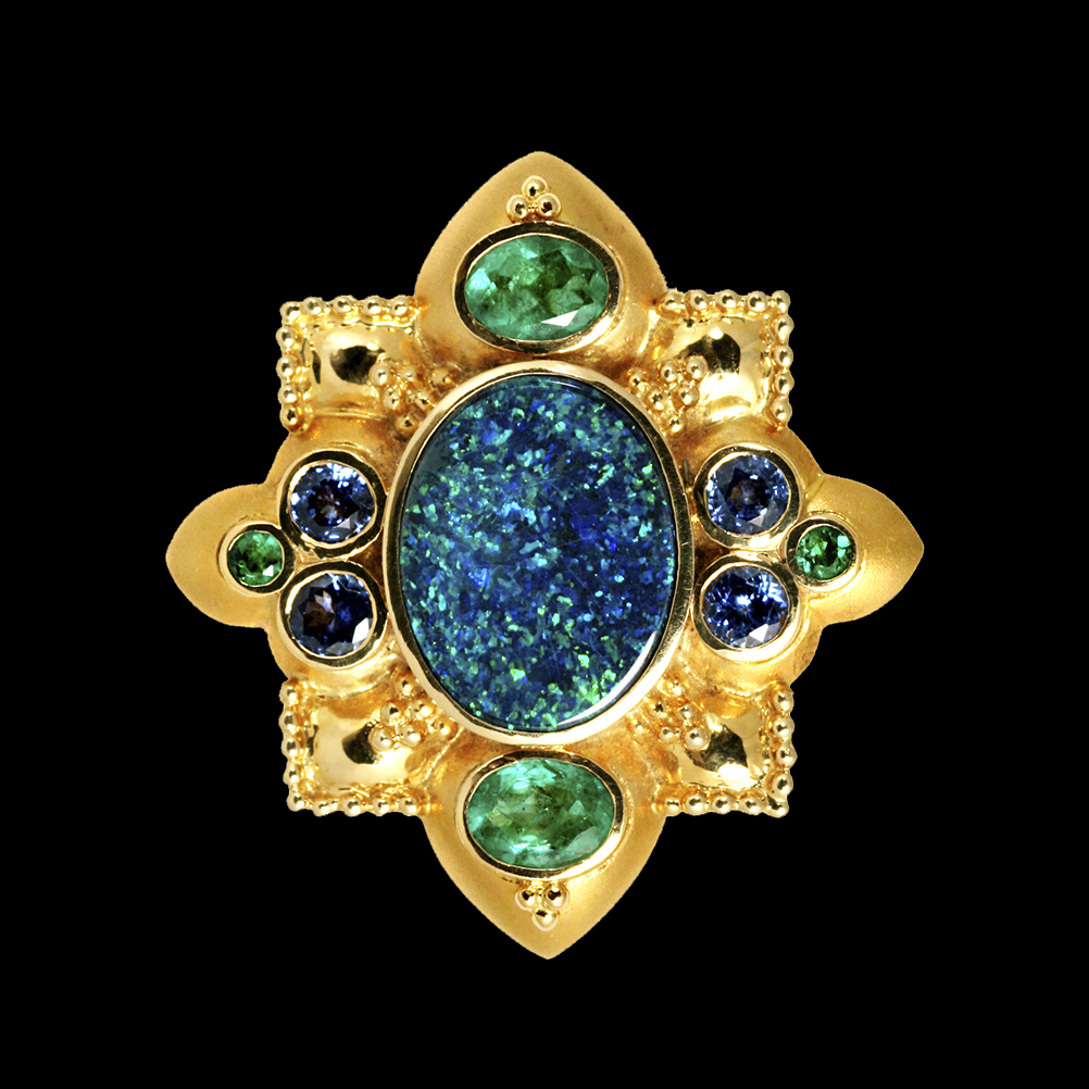 A very beautiful and collectible jewel, this pendant incorporates a black opal with amazing green pin fire on a heavenly blue body color in the center stone to pull the colors of the opal towards the viewer’s eyes. Crevoshay highlights this gem with emeralds and soft blue sapphires. The gold work is engraved and granulated, and the back is engineered with the versatile mechanism, distinctive of Crevoshay. A double clasp, pendant, and brooch findings allow the viewer endless possibilities. ~18K yellow gold with Emerald, Sapphire and Opal.