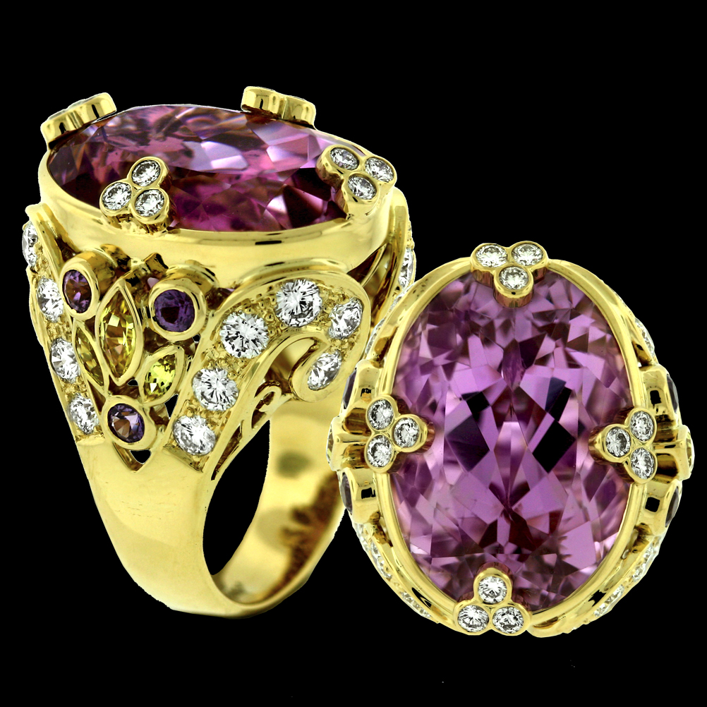 18K yellow gold with Kunzite, Diamond and Sapphire.