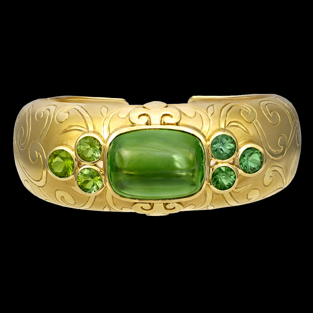 This fabulous Crevoshay cuff bracelet features an extremely rare Green Zircon. It is attended by six green Tourmalines. The stones are bezel set on and intricately engraved field of gold with both bright and satin finishes. 18K yellow gold with Zircon (1) = 32.83 cts. “H”, Tourmaline (6) = 4.10 cts. “H”. Special Provenance; “Beyond Color” Collection Headley Whitney Museum, Marylou Whitney John Hendrickson Galleries Inaugural Exhibition, February through July 2009. This jewel was part of the exhibition titled “The Shape of Matter – Through an Artist’s Eye” at the Perot Museum of Nature and Science from October 21st, 2021 through April 20th, 2022.