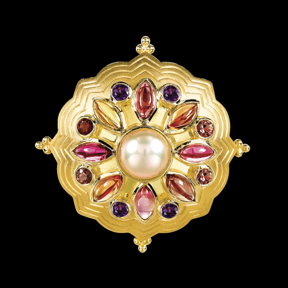 Every year natives put offerings of flowers in the Amazon in thanks for the food and fertility brought by the river goddess Iemanja. 18K yellow gold with Pearl, Tourmaline and Sapphire. Museum Collection.