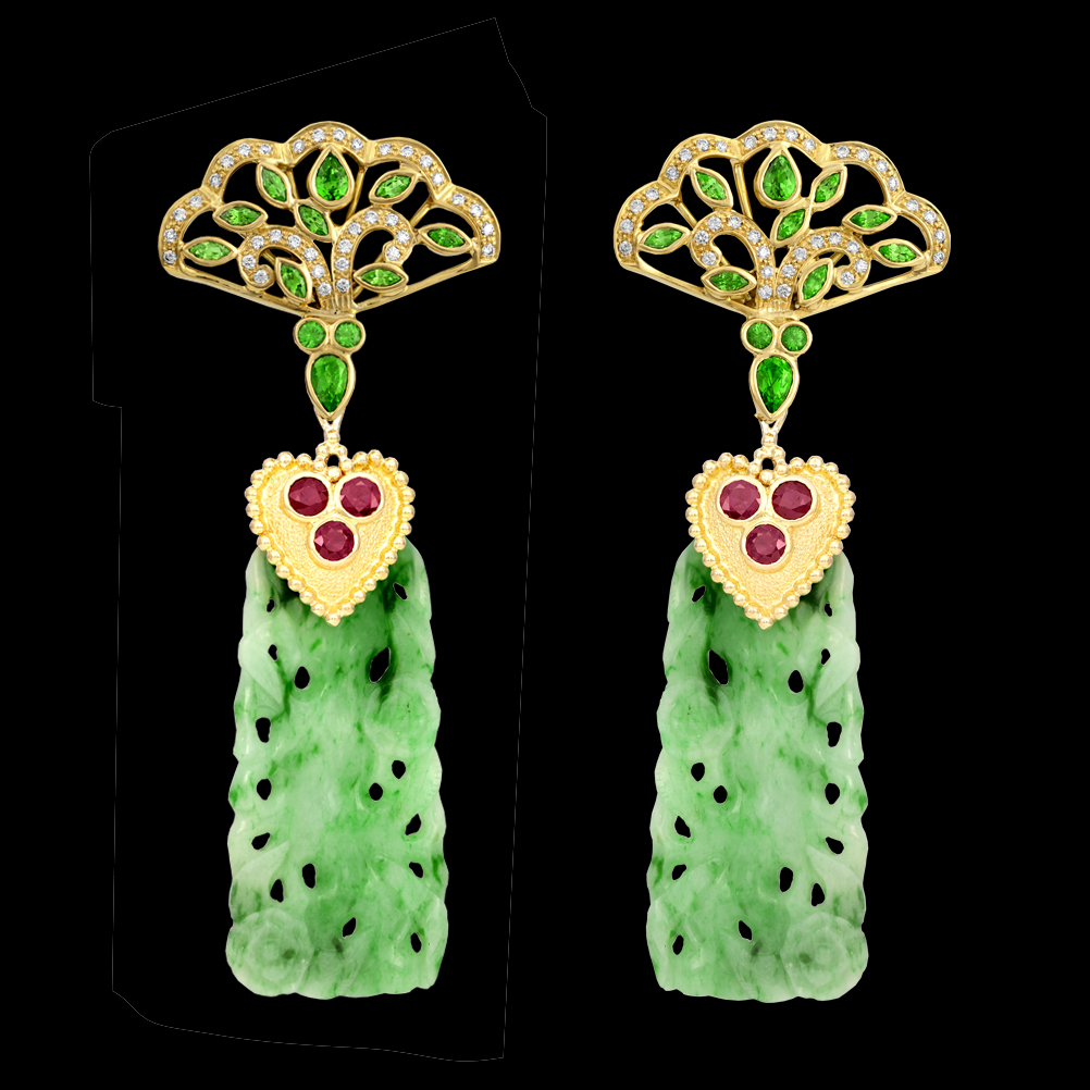18K yellow gold with Tsavorite, Diamond, Jade and Ruby.