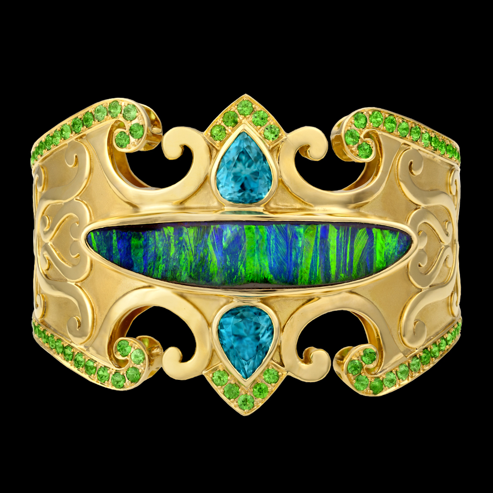 “Nefertiti” is one of a series of “Power Bracelets” Crevoshay created to celebrate the ability, grace and beauty that is every woman’s birthright. Women really do feel more confident, inspired and emboldened when they put one on! This bracelet honors Nefertiti who not only was a great beauty; she ruled Egypt from the time of her husband’s death until her son was old enough to become Pharaoh. 18k yellow gold with Opal, Tsavorite and Zircon. This jewel was part of the exhibition titled “The Shape of Matter – Through an Artist’s Eye” at the Perot Museum of Nature and Science from October 21st, 2021 through April 20th, 2022.