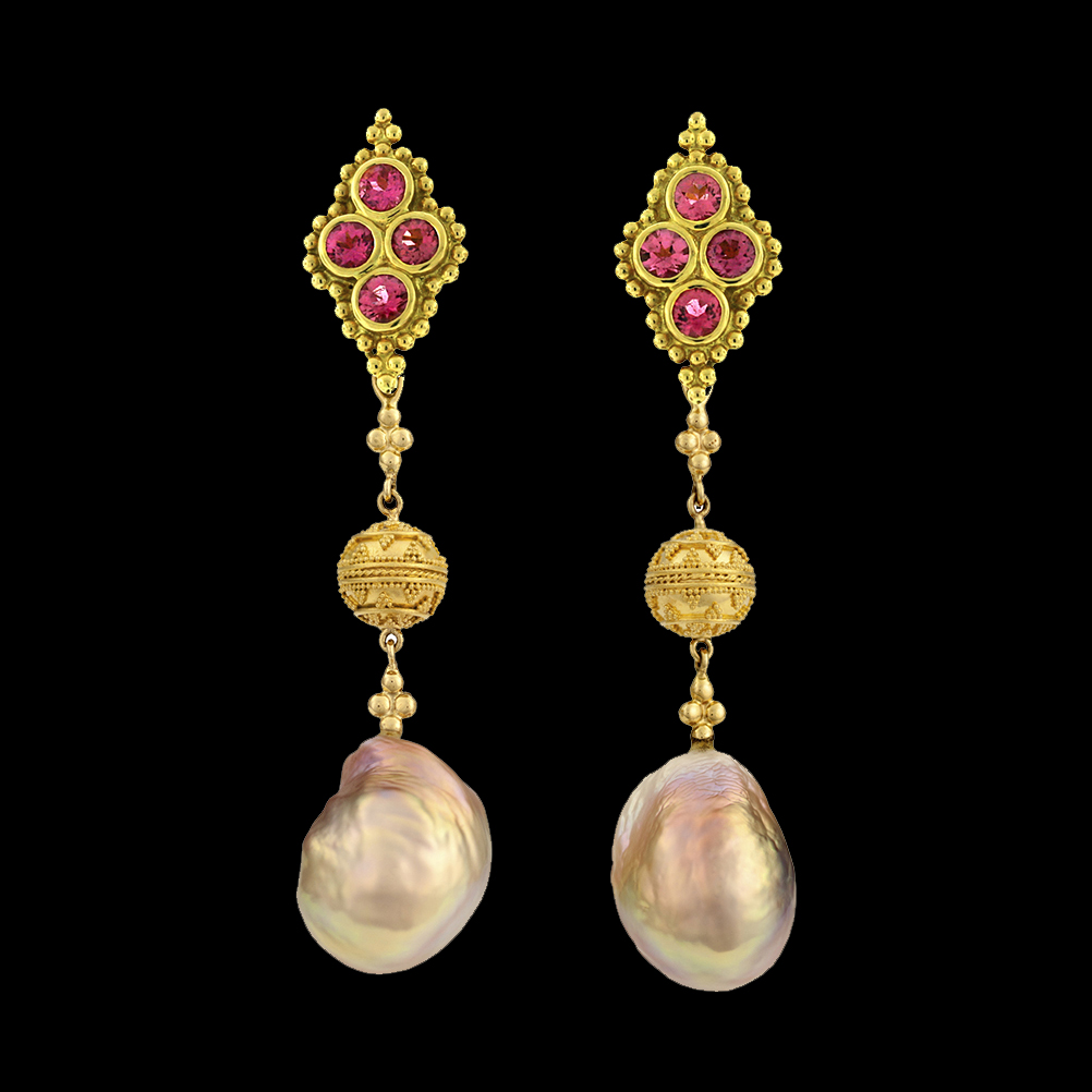 18K yellow gold with Tourmaline, CFW Fireball Pearls and 22kt Bali Beads. Gallery Collection.