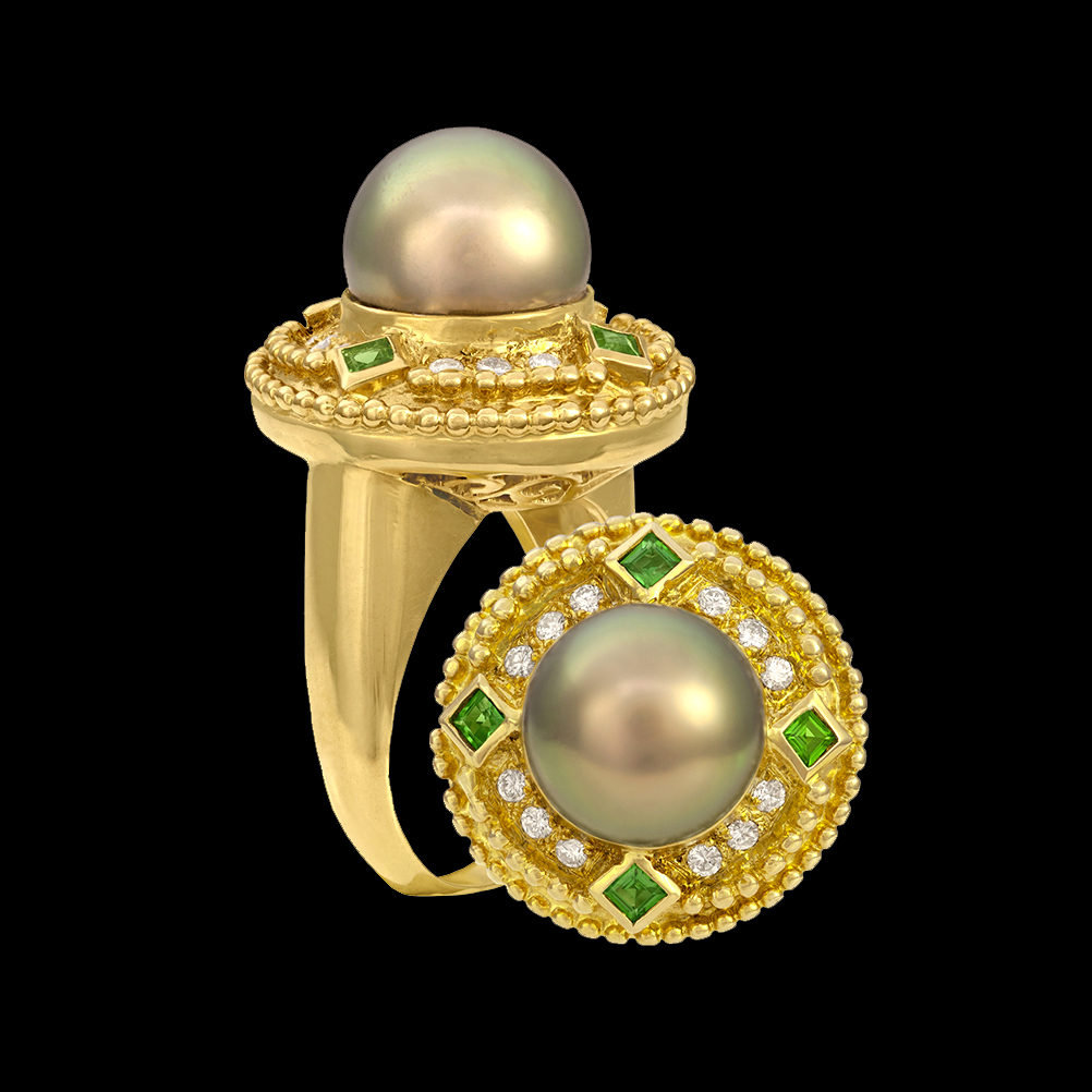 A pistachio Tahitian pearl is accentuated by green tsavorite garnets and crisp white diamonds. This Crevoshay “Princess” is ring richly adorned with hand piercing and granulation. 18K yellow gold Pearl, Tsavorite and Diamond.