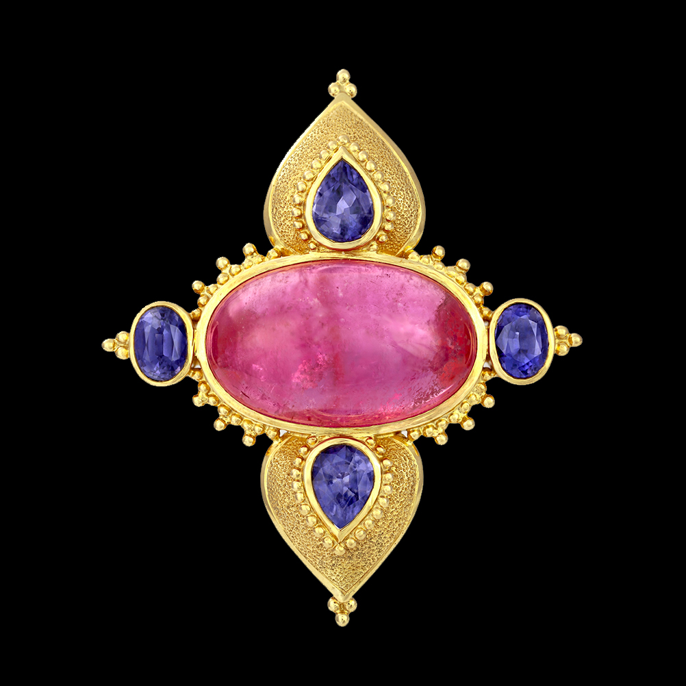 This amazing California Tourmaline is contrasted by very fine fully saturated Iolites. The elaborate gold work incorporates granulation, chasing, bright cut and wonderful Crevoshay engineering for versatility. 18K yellow gold with Tourmaline and Iolite. American Heritage Series