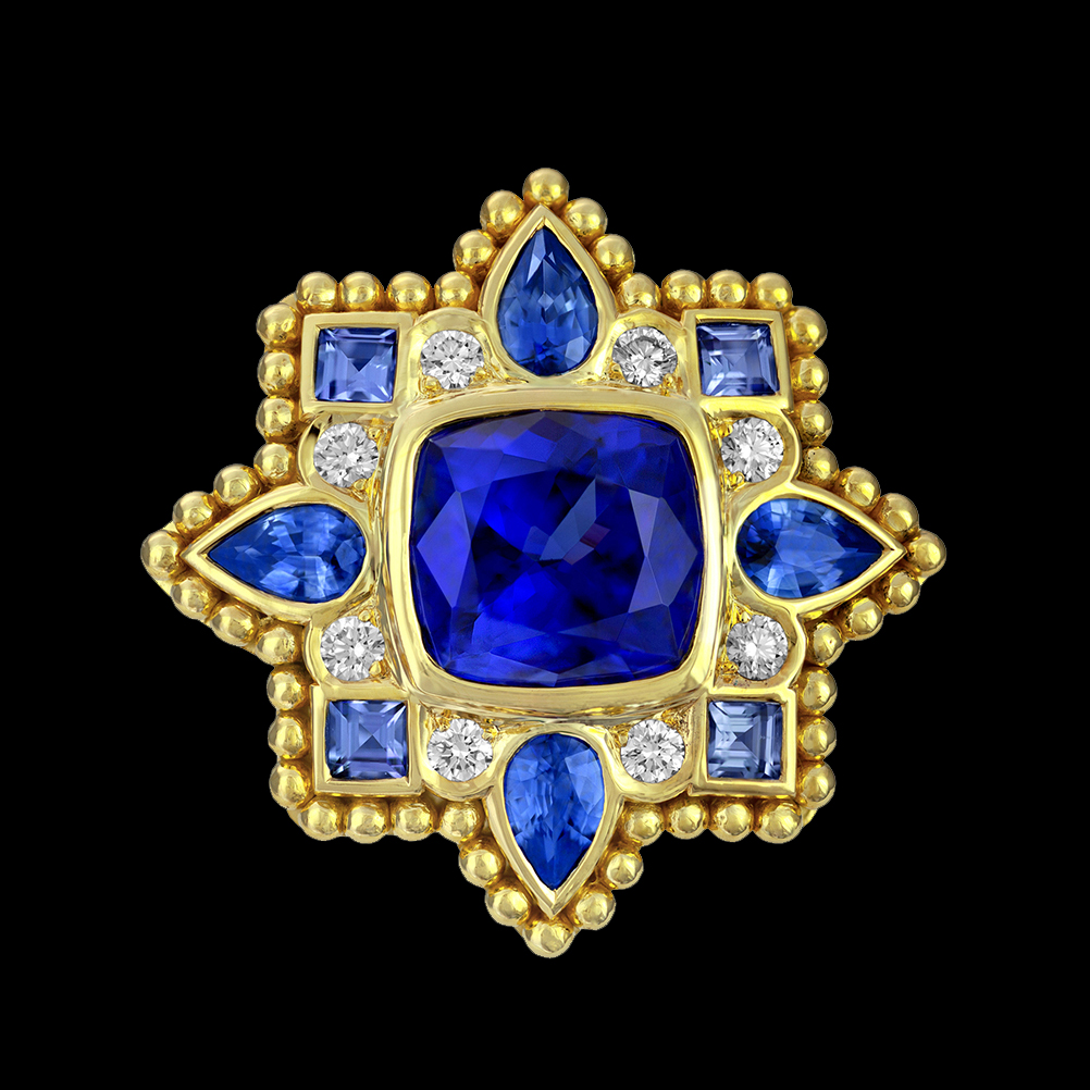 This classic Crevoshay 18K composition with lush blue Tanzanites and brilliant Diamonds is embellished with a radiant border of granulation. For enhanced value, it can be worn as a broach or a pendant. 18K yellow gold Tanzanite and Diamond.