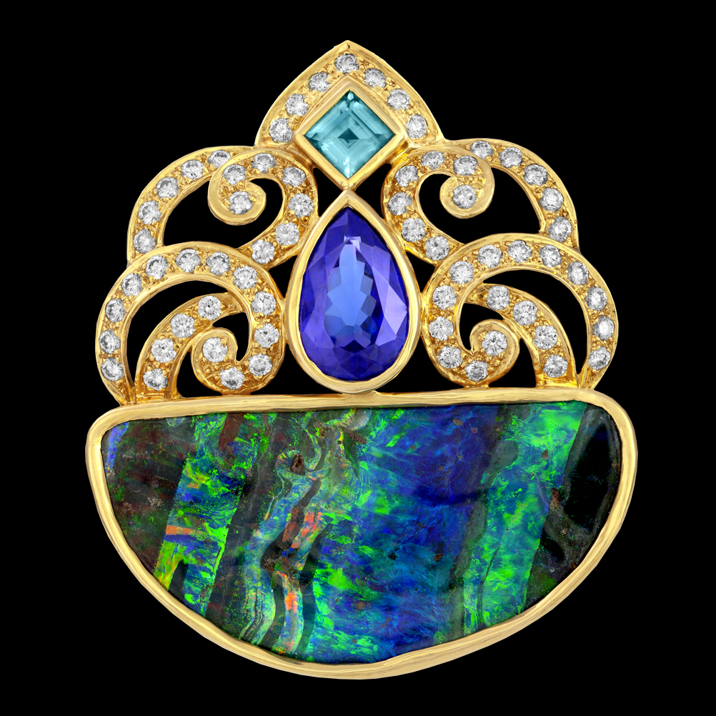 The play of light and color, darks and lights, which inspired the artist to reflect on jazz and painting. She melds the concept of chiaroscuro from Rembrandt with the dynamic sounds of jazz. ~18K yellow gold with Boulder Opal, Tanzanite, Zircon and Diamond.