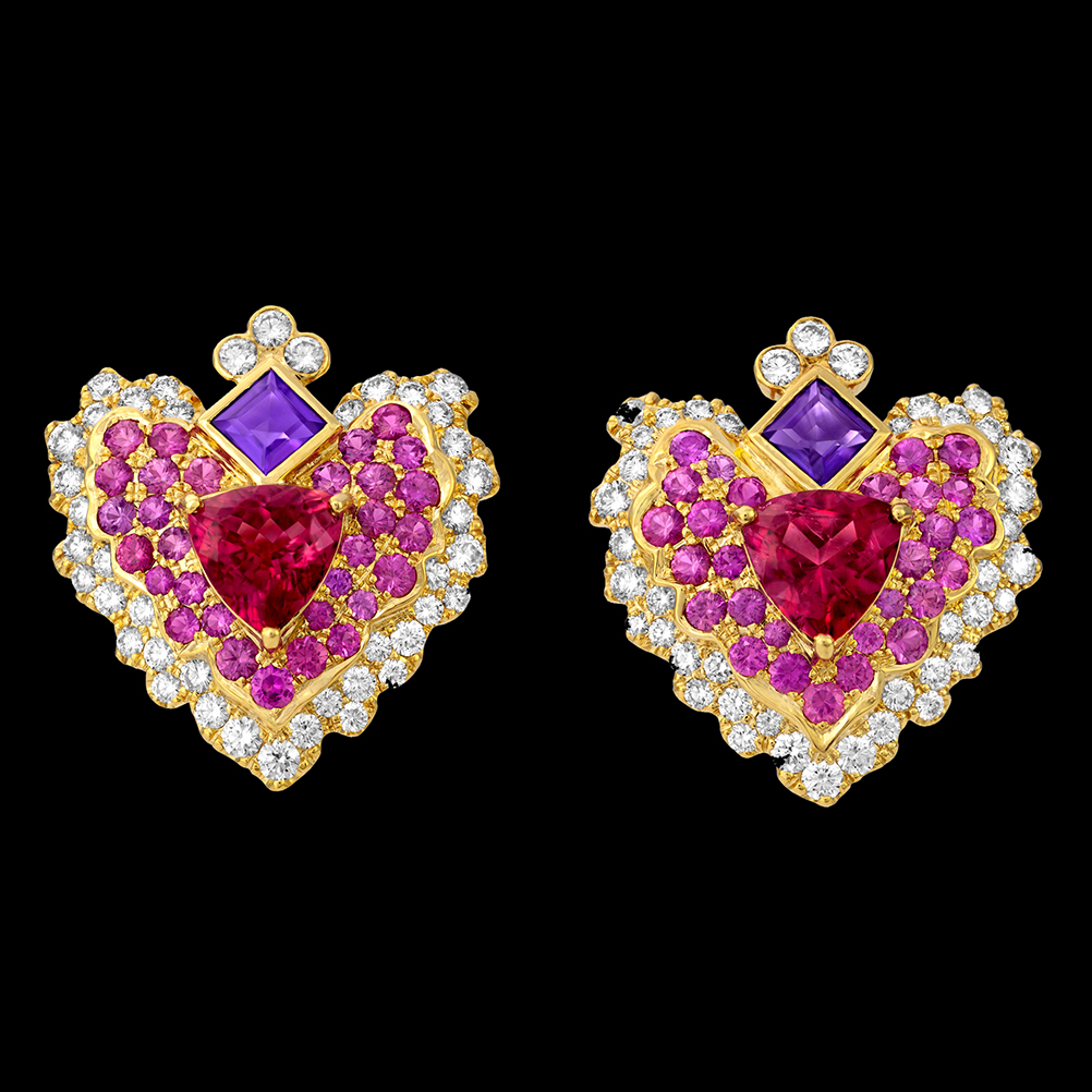 This beautiful pair of 18K Crevoshay heart earrings represents both the joyous and nourishing love the wearer gives others, and the abiding happiness of the love she receives. 18K yellow gold with Tourmaline, Amethyst, Sapphire and Diamond.
