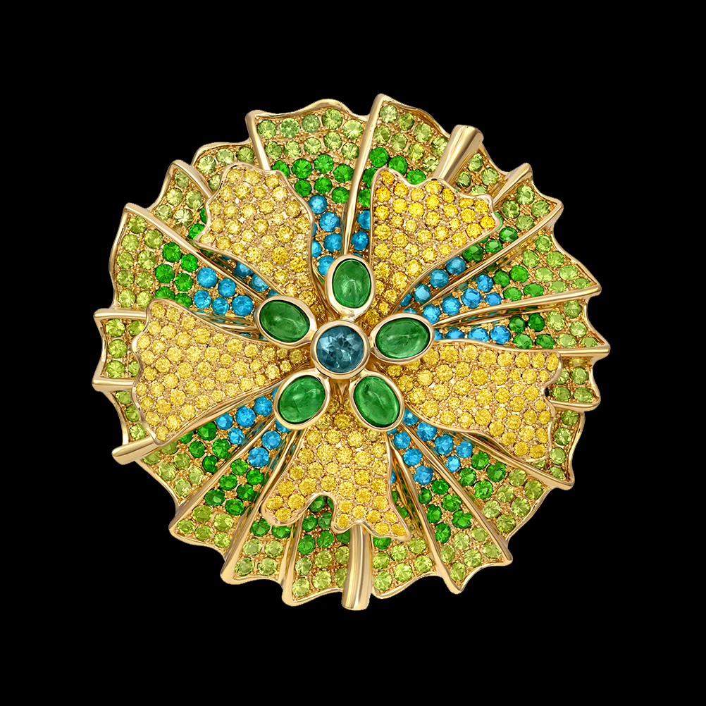 18K yellow gold with Diamond, Tsavorite, Apatite, Emerald, Peridot and Tourmaline. This jewel was part of the exhibition titled “The Shape of Matter ? Through an Artist?s Eye” at the Perot Museum of Nature and Science from October 21st, 2021 through April 20th, 2022.
