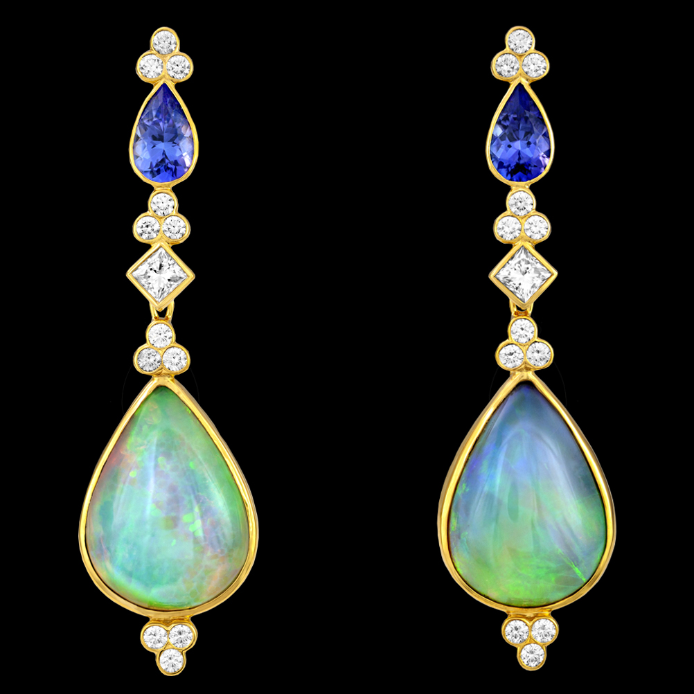These lovely 18K Crevoshay Tanzanite, and Diamond earrings complement and enhance the wearer’s natural elegance. – 18K yellow gold with Tanzanite, Diamond and Opal.