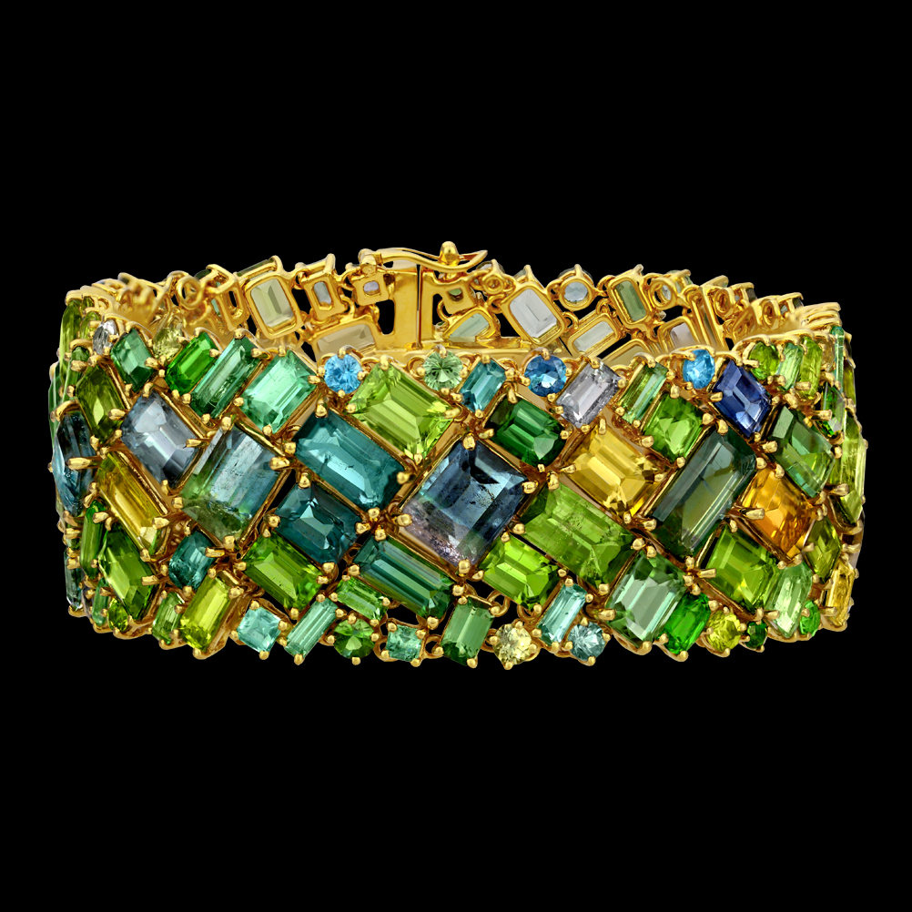 This stunning Crevoshay composition features the rarest colors form the now depleted Stewart Lithia tourmaline mine in southern California. The Stewart Lithia mine was famous for fabulous “Bubble Gum” pink stones. 18k yellow gold with California Tourmaline.