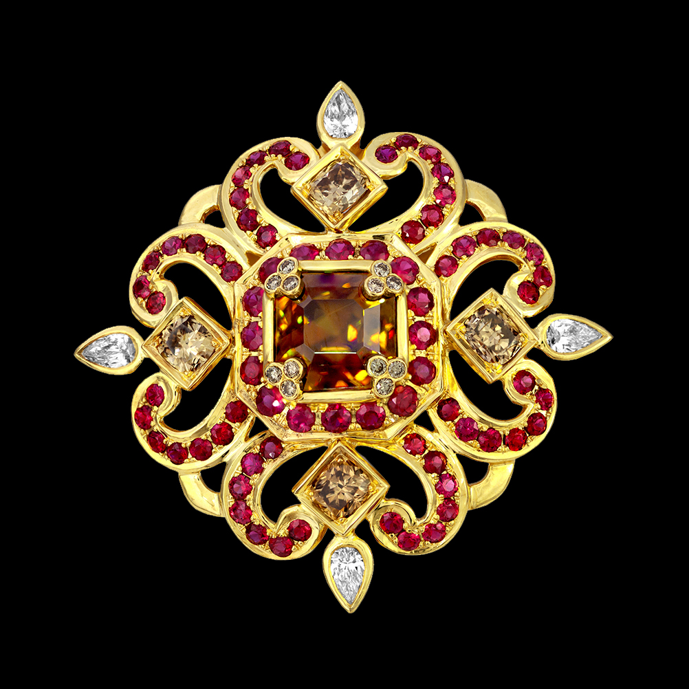 Sphene, very rare above five carats, is one of Crevoshay’s favorite stones because it is tricloric, meaning that it has three colors, usually some mix of brown, yellow, green and orange, and because it has amazingly high dispersion, which is the scattering of light. – Sphene , Diamonds and Ruby.