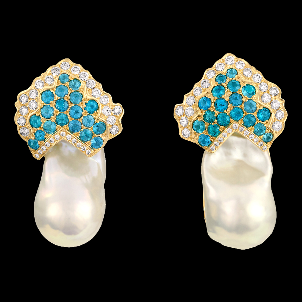 18K yellow gold earrings with Pearl, Diamond and Apatite.