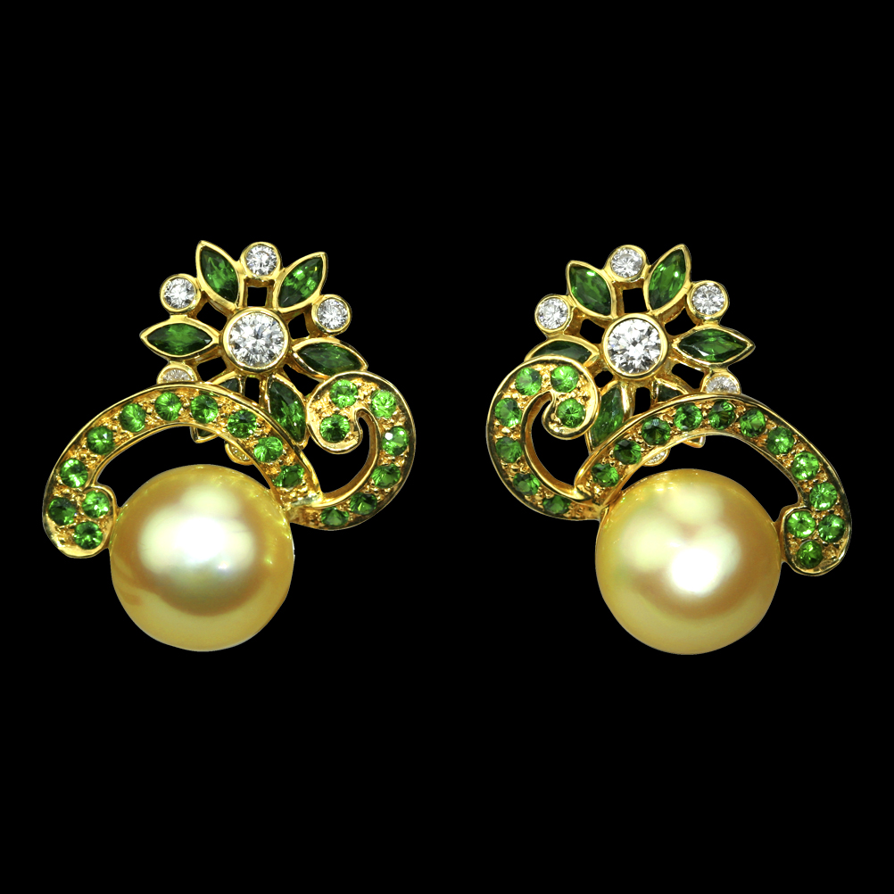 These elegant and stylish earrings feature beautiful South Sea Pearls, beautifully matched Tsavorites and fine Diamonds in a design inspired by nature. 18K yellow gold with Tsavorite, Diamond and Pearl. Couture Collection