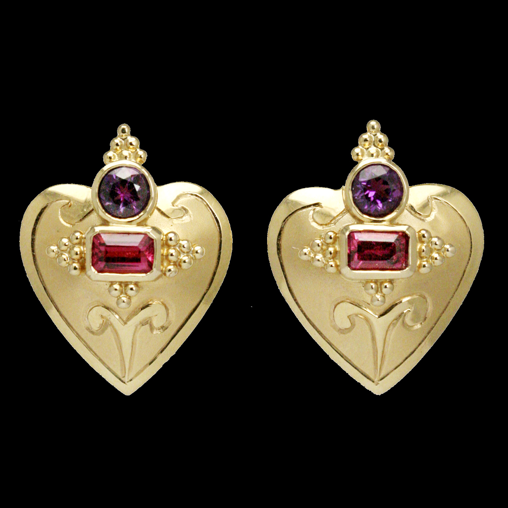 The heart-shaped gold frame is a reoccurring shape in designs by Crevoshay. This valentine jewel is adorned by hot pink Tourmaline and vibrant purple Amethysts. The engraving and granulation is offset by a soft matte finish allowing the beautiful color combination of the jewels to visually lift off the mounting. 18K yellow gold wih Amethyst and Tourmaline. American Heritage Series.