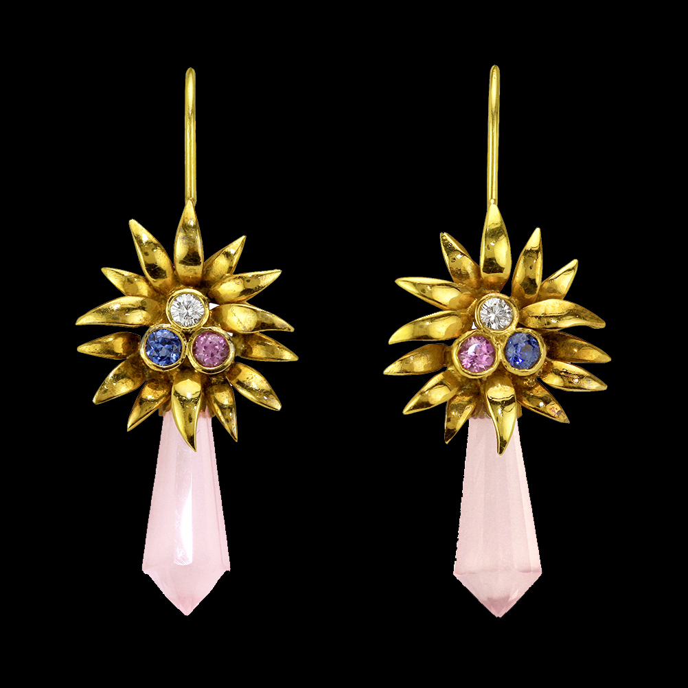18K Yellow Gold pair from the artists own collection in a flower motif featuring particolored sapphire and rose quartz.